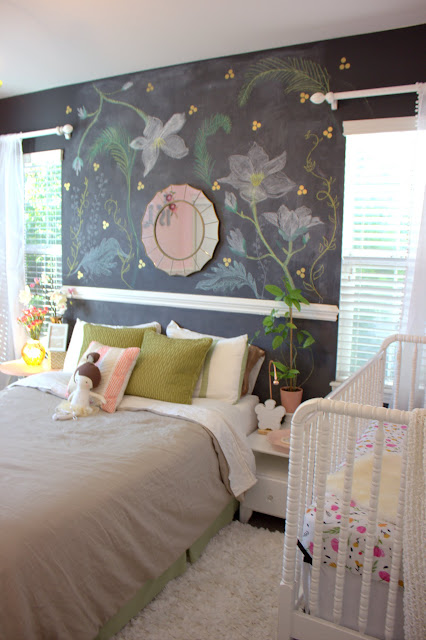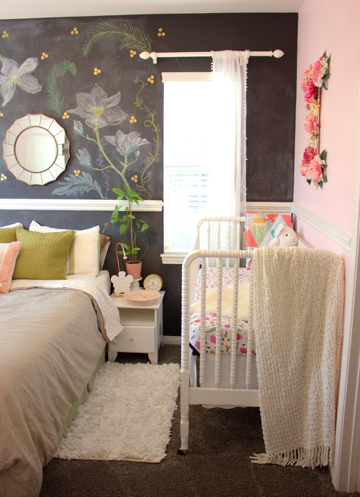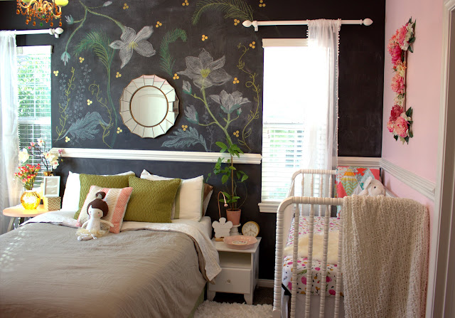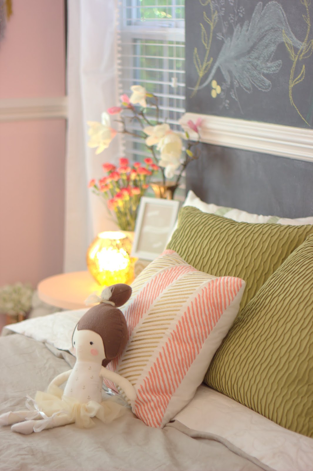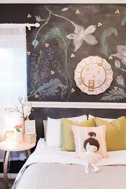 The wall above the bed was painted with black chalkboard paint so I drew some floral designs to try it out, but, I will probably be switching that up soon.