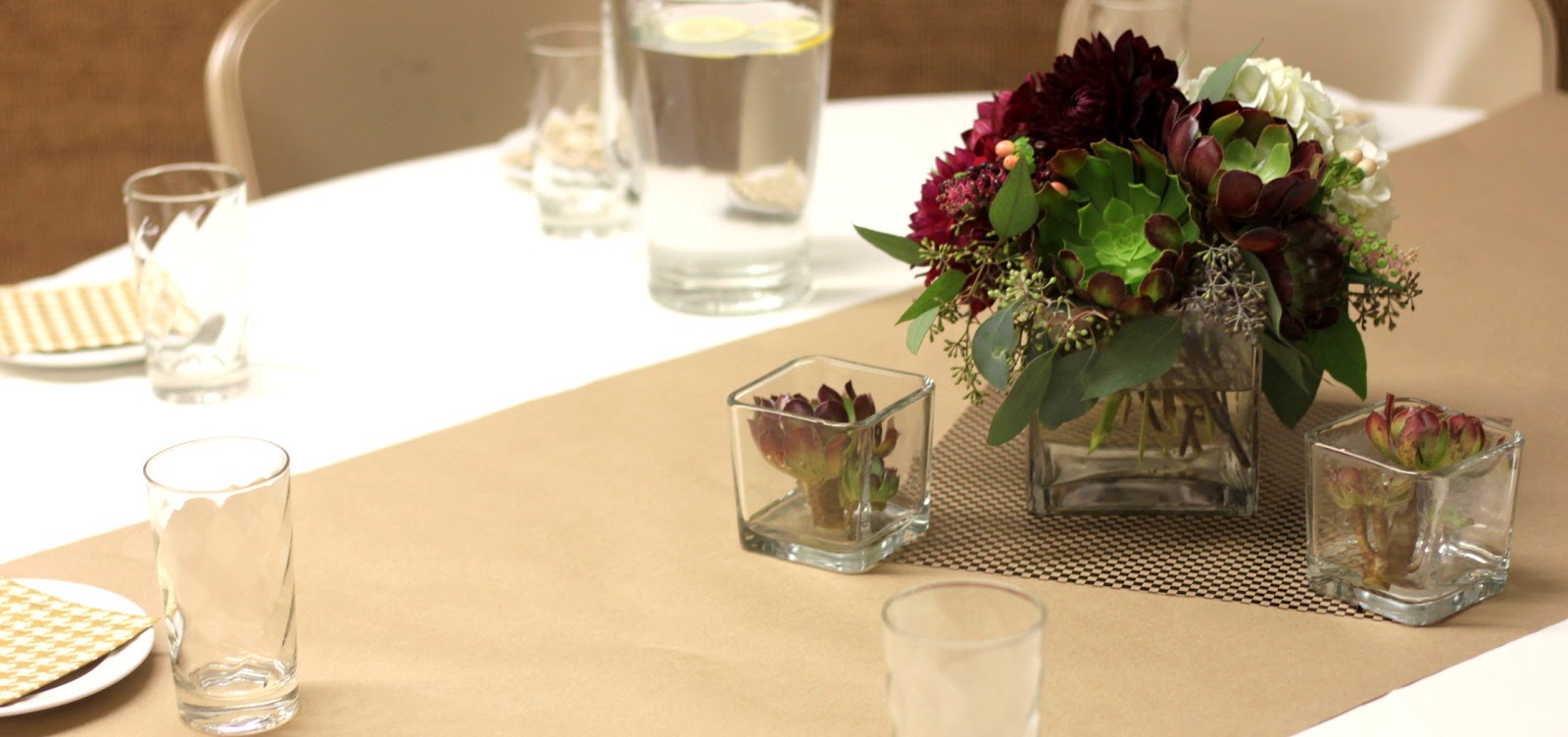 First off was centerpieces. We set up 7 round tables and I basically scavenged flowers, plants and herbs from my yard to put together some examples of inexpensive centerpieces. I used fabric tablecloths and runners made of cut butcher paper.